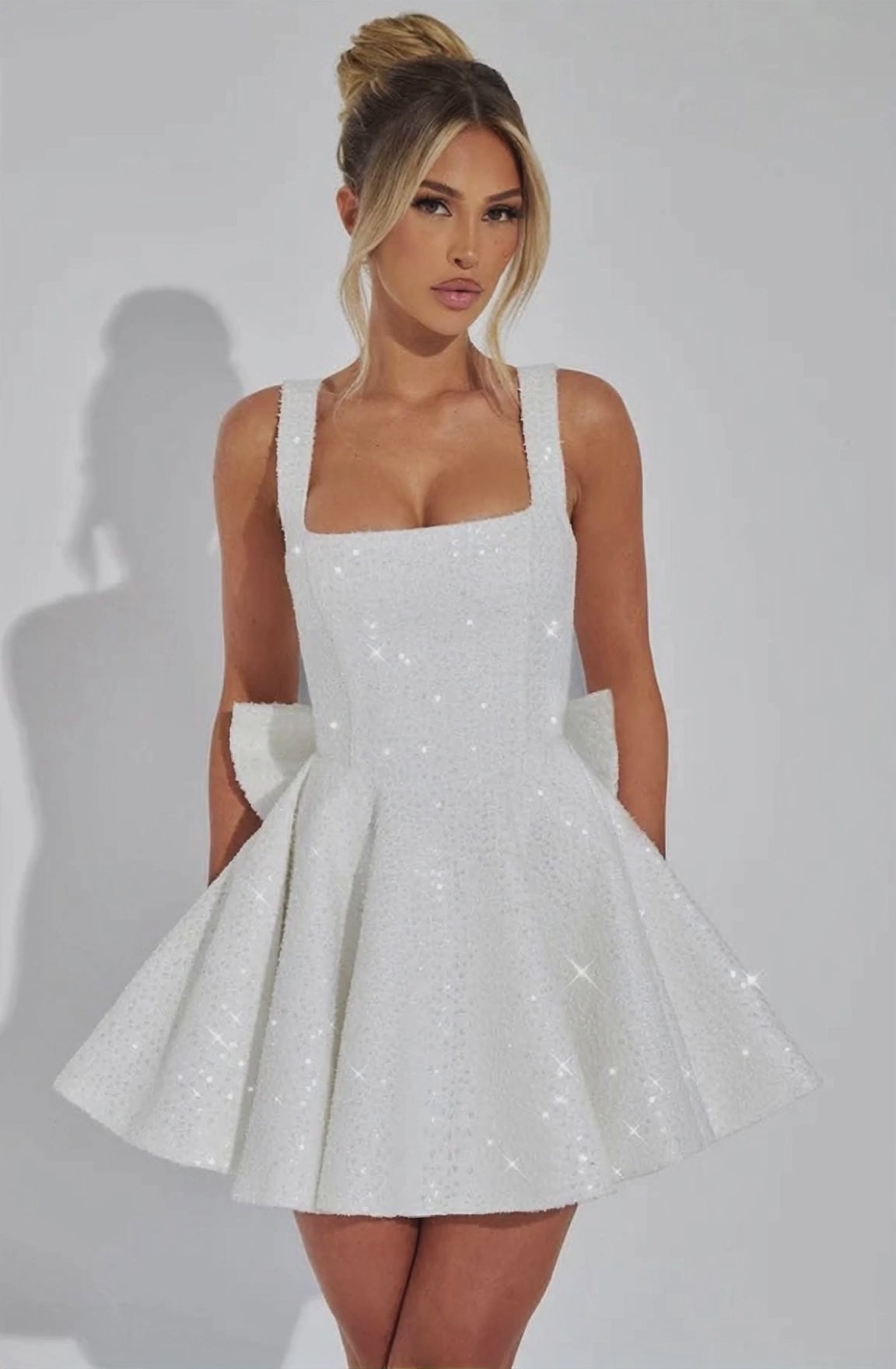 Make an unforgettable entrance with the Ivory Dream Bow Mini, a sparkling sequin tweed mini dress designed for those who love playful elegance. With its voluminous circle skirt and statement detachable bow, this piece is the perfect blend of sophistication and fun.